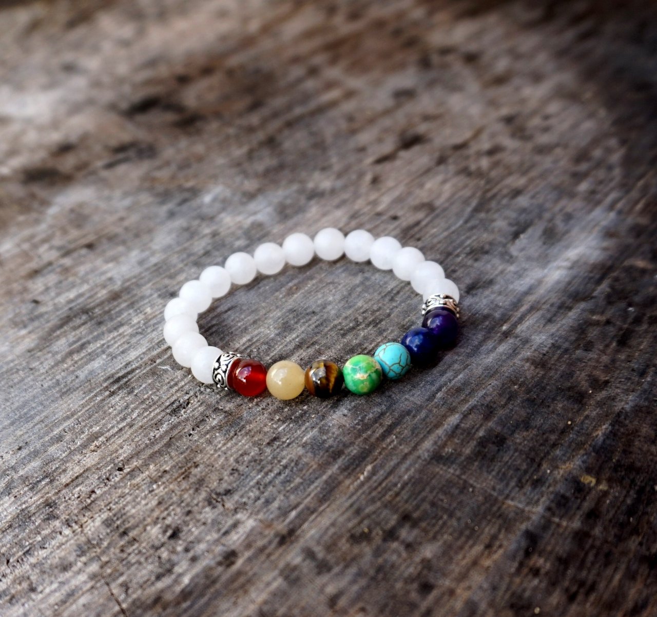 Nárámek obsahuje polodrahokamy všech čakrových barev. Čakra je sanskrtské slovo a znamená „kolo“. Čakry jsou energetické víry v těle každého člověka. Můžete si je představit jako větrníky, které pohání různé druhy energií. Jimi proudí energie dovnitř našeho těla i ven z těla. Čakrový náramek může pomoci Vaše čakry harmonizovat a je to univerzálně hezký módní doplněk, který se spontánně hodně líbí i dětem.
